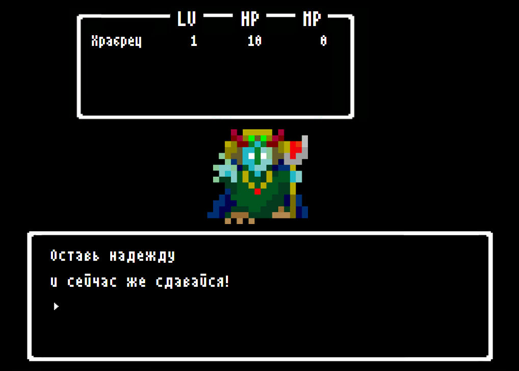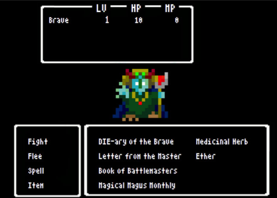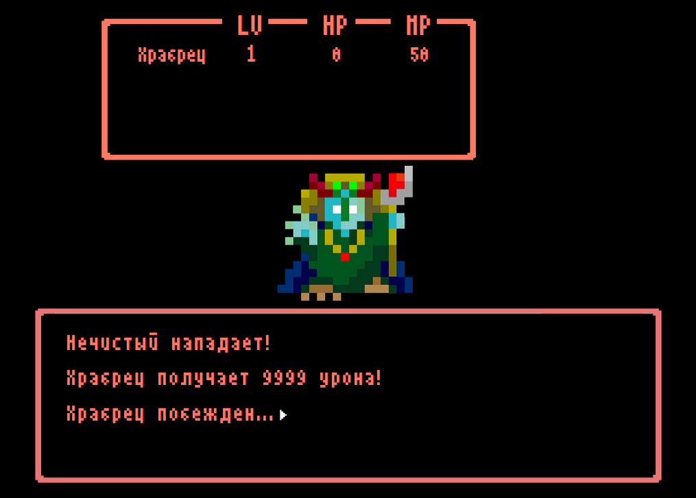 Ikinari Maou от Shintaro Ito (для создания использовался движок TyranoBuilder). Это пошаговая РПГ в стиле ретро, цель которой — победить главного босса героем 1-го уровня используя правильную последовательность действий. Суммарно перевести нужно было примерно 1500 слов.