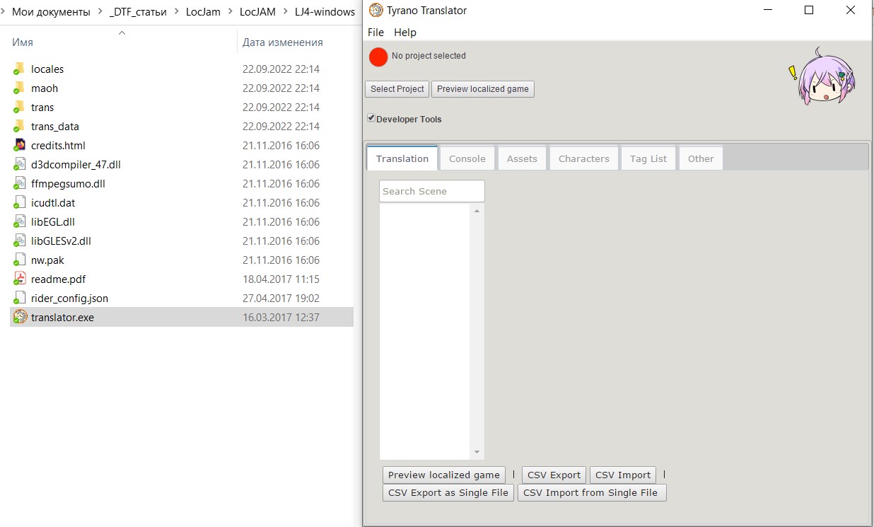 - Интегрировать файлы перевода в игру при помощи утилиты Tyrano Translator (шла в комплекте).