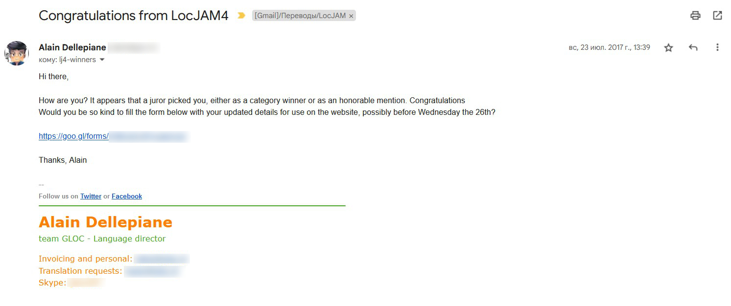 Когда перевод был готов, нужно было зайти на определённую страницу на сайте LocJAM, заполнить форму участника и прикрепить к ней архив со всеми файлами. Там же можно было поставить галку в графе «меня интересуют предложения о работе».