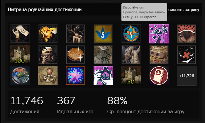 Первые пять достижений в верхнем ряду — самые редкие на моей витрине достижений в Steam.