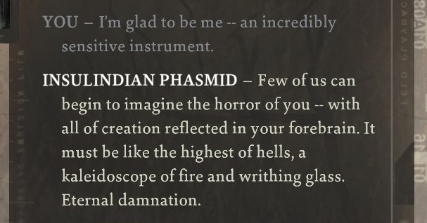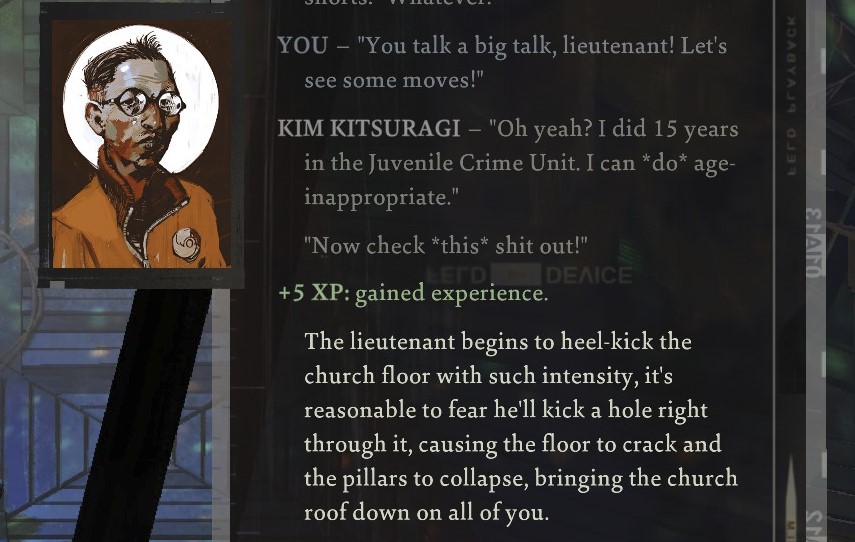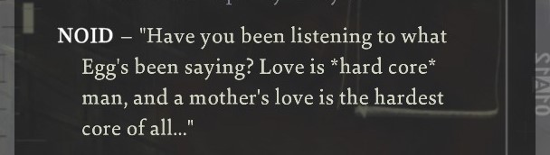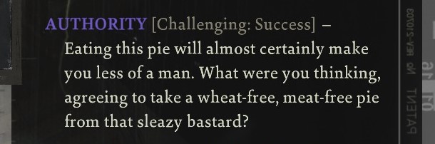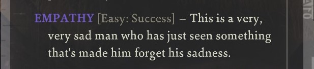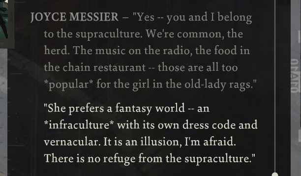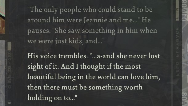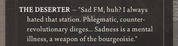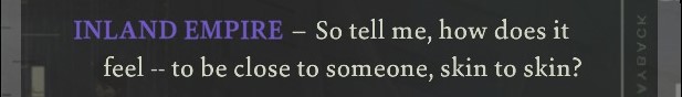 Мне удалось также осознать ценность этого открытия, когда я параллельно начала играть рандомный никому не известный инди-квест Subterraneous, где геймплей процентов на 90 состоит из абсолютно пустой болтовни, которая даёт герою примерно нихуя. Потому что, как правило, ты и так знаешь, что тебе нужно сделать действие Х, чтобы получить Y. А когда болтаешь с NPC, они тупо льют тебе воду в уши и говорят примерно то же самое, что ты и так знаешь (особенно, если много играешь квесты). Это не даёт ни чувства прогрессии, ни удовлетворения и превращается просто в трату времени. Если учесть, что довольно часто болтовня — один из основных геймплейных элементов в адвенчурах, близких к классическим квестам, то сразу видно, какой проект будет провальным — тот, который не даёт абсолютно никакой полезной информации при всей этой болтовне и даже не справляется с банальной задачей — раскрытием персонажа. Огромная заслуга создателей Disco Elysium в этом и состоит — абсолютно любой текст занимает своё место. Эти тексты: