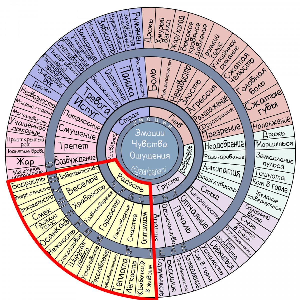 Напоминает мемы из разряда «я в твои годы уже умер». Кто вообще сказал, что «нормальная» жизнь — это постоянная радость, а самоцель её — счастье? Стоит внимательно присмотреться к абсолютно любому кругу эмоций (помогает людям начать прислушиваться к себе и учиться распознавать и называть свои чувства и эмоции; часто используется в процессе психотерапии), чтобы заметить, что условно позитивные эмоции и чувства занимают там менее четверти от всего возможного спектра внутренних переживаний человека.