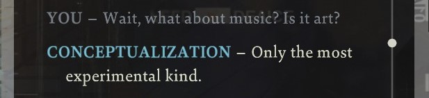 Об искусстве игра тоже рассуждает, и я рада, что в чём-то мы сходимся: