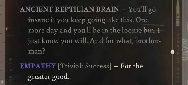 Время от времени проскакивают и такие мысли в игре. Но лично для меня те, кто причисляют себя к «безумцам» в игре, являются самыми «здоровыми». И в Диско это обычно не вопрос веры во что-либо (как, например, в случае с криптидами), а в том, чтобы оставаться собой. «Нормальность», как говорится, у каждого своя. Поэтому и алкоголизм ГГ я помещаю в отдельную категорию. Я считаю, ментально герой не болен. Поэтому во все свои прохождения от всяческих субстанций я отказывалась. И знаете, ему было норм. Боль душевная, вне всяких сомнений, доставляет страданий, но убивать вдогонку печень было бы излишне.