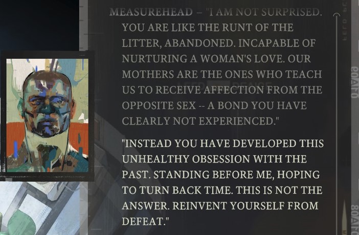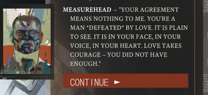 К моему удивлению, в разговоре с Measurehead во время нацистского побочного квеста, он много рассуждает о любви. Некоторые его мысли довольно любопытны.