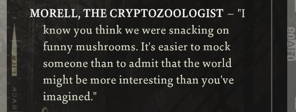 Это штуки, которые понимаешь, если усердно рефлексируешь и изучаешь себя, не важно — приучили ли тебя тому с детства, само так вышло или научили в терапии. Иронично, что всю хрупкость человеческой натуры в игре лучше всех понимает криптид. И всё же как закономерно, что именно он, будучи носителем этого осознания, является загадкой для всех персонажей мира игры. Они буквально не верят в его существование!