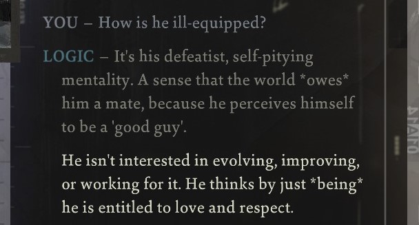 Можно считать, что Disco Elysium — это игра о любви. О любви к ближним, и к себе. Хотя, точнее будет сказать, что это игра о недостатке любви и её отсутствии.