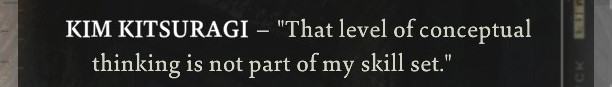 Помимо этого, в игре наглядно видно разницу и огромный контраст между тем, что обычно происходит в голове у человека и тем, что он «выдаёт» наружу, а следовательно и тем, что видят окружающие. В этом состоит огромная жизненная правда: не всегда то, что ты говоришь и делаешь восприниматься людьми так, как ты задумал. И не каждый собеседник будет задумываться над глубинными причинами сказанного тобой. Это в который раз подчёркивает хрупкость человеческой натуры и напоминает о том, как важно быть терпимее друг к другу. Как Ким Кицураги к коллеге, даже когда тот фашист, наркоман, забулдыга или кто-то ещё.